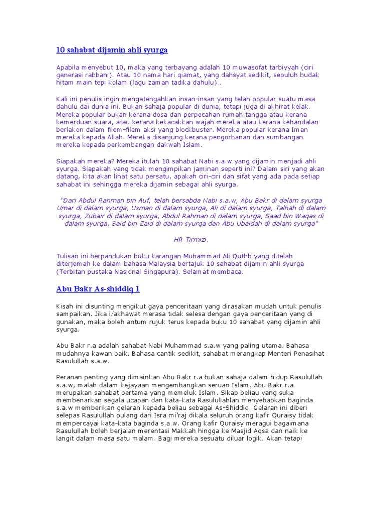 10 sahabat yang dijanjikan surga. Abu bakar ash shidiq abu bakar merupakan orang pertama yang masuk islam. Sepeninggal rasulullah di tangan merekalah perjuangan islam diteruskan dan lewat mereka jugalah ilmu islam berkembang dan berjaya sampai hari ini. Saiyyidina abu bakar as siddiq r a.