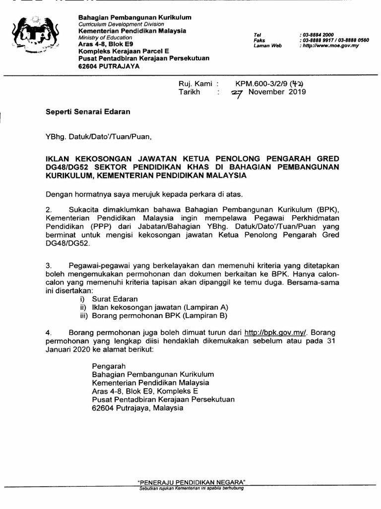 Bahagian Pembangunan Kurikulum Kementerian Pendidikan Malaysia Aras 4 8 Blok E9 Kompleks Kerajaan Parcel E Pusat Pentadbiran Kerajaan Persekutuan 62604 Putrajaya