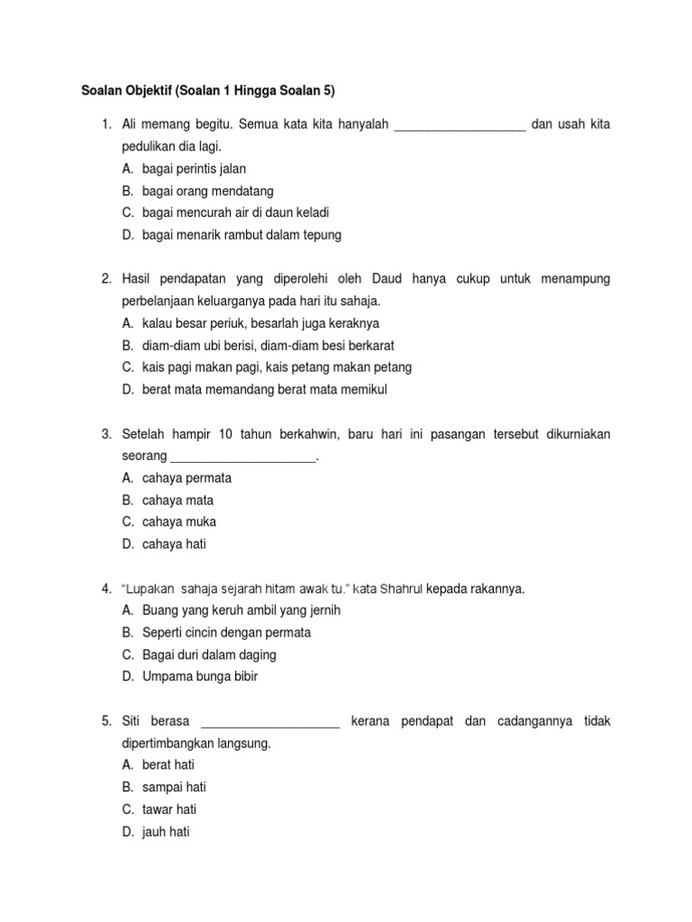 Soalan Objektif Soalan 1 Hingga Soalan 5