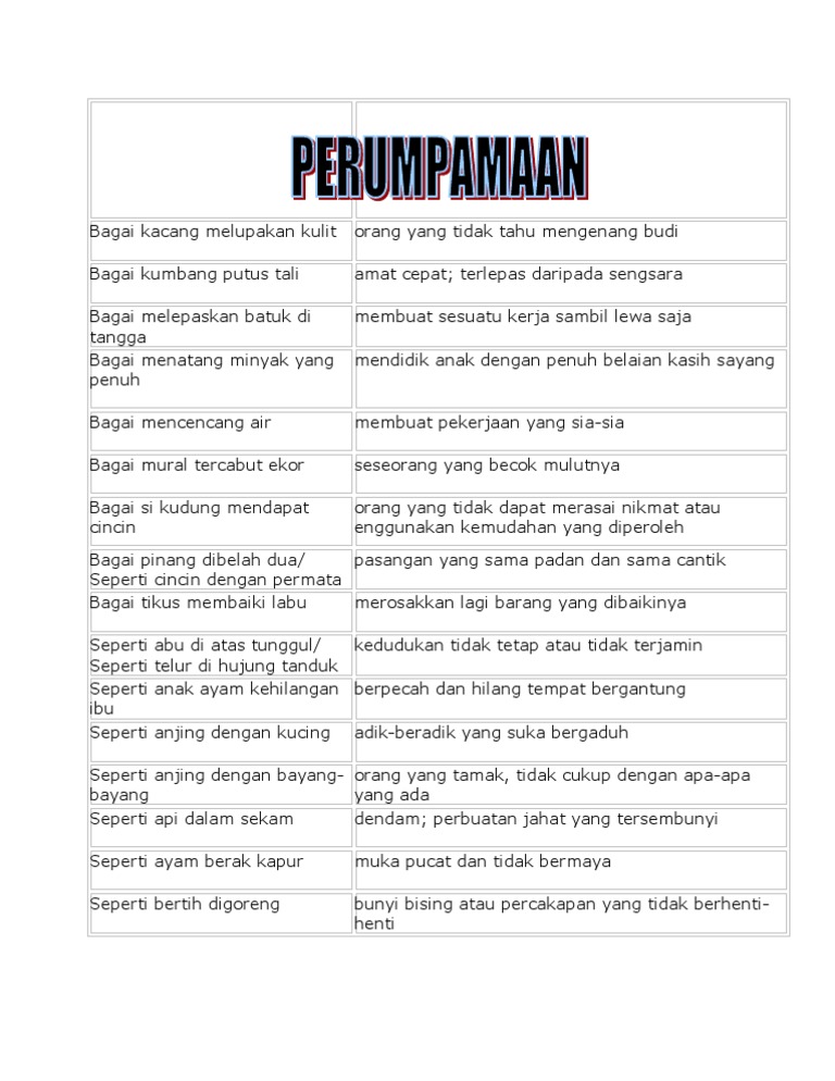 Perumpamaan yang sesuai untuk pernyataan di atas ialah. Putus harapan untuk meneruskan hidup. Berasa senang hati bagai kucing main daun hebat dan lincah bagai kucing menjemput api tidak tercapai apa yang dihajatkan dan sesuatu yang digunakan untuk mendapatkan hajat itu turut hilang bagai kucing takut akan balur lelaki yang takut dan malu kepada orang perempuan bagai kucing tidu dibantal hidup mewah bagai kuku dengan isi sangat rapat bagai kumbang putus tali 1.
