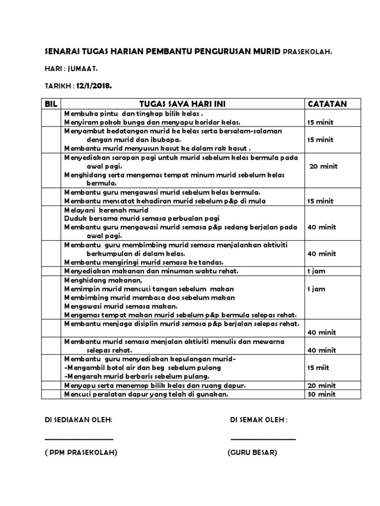 Senarai Tugas Harian Pembantu Pengurusan Murid Prasekolah