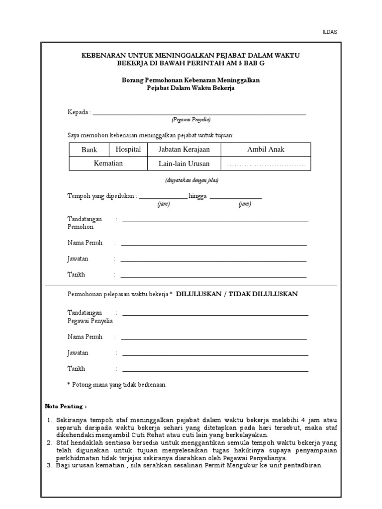 Sekiranya tempo h pegawai meninggalkan pejabat dalam waktu bekerja melebihi 4 jam atau separuh daripada waktu bekerja sehari yang ditetapkan pada hari tersebut maka pegawai dikehendaki mengambil cuti rehat atau cuti lain yang berkelayakan. Sekiranya tempoh pegawai meninggalkan pejabat dalam waktu bekerja melebihi 4 jam atau separuh daripada waktu bekerja sehari yang ditetapkan pada hari tersebut maka pegawai. Borang permohonan kebenaran meninggalkan pejabat dalam waktu bekerja.