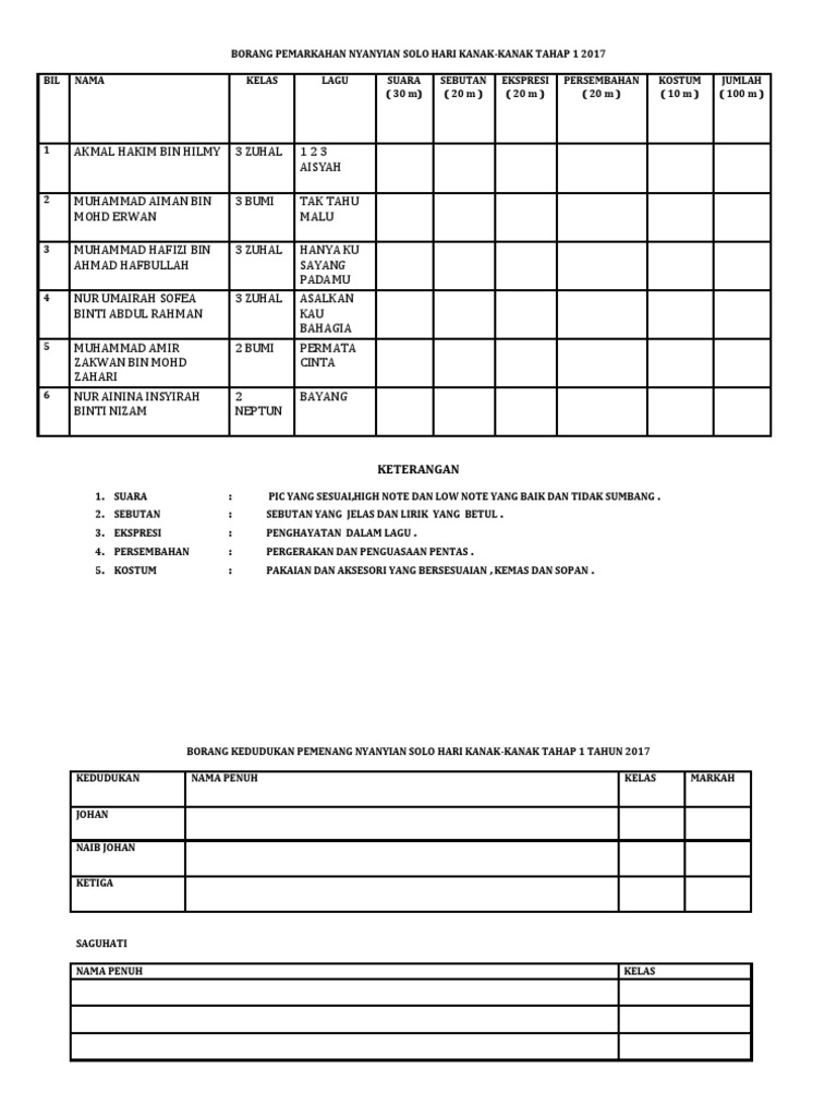 Contoh Borang Pemarkahan Pertandingan Nyanyian