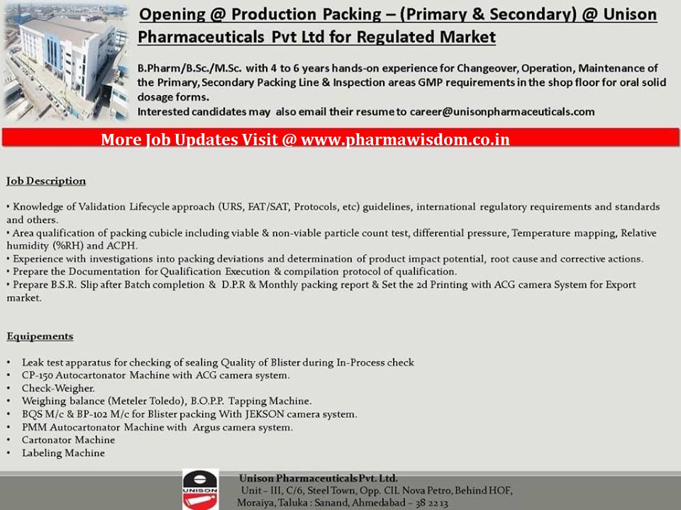 Openings In Production Packing Unison Pharmaceuticals Pvt Ltd Pharma Wisdom